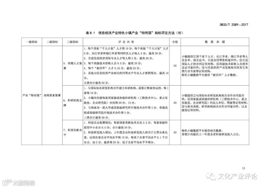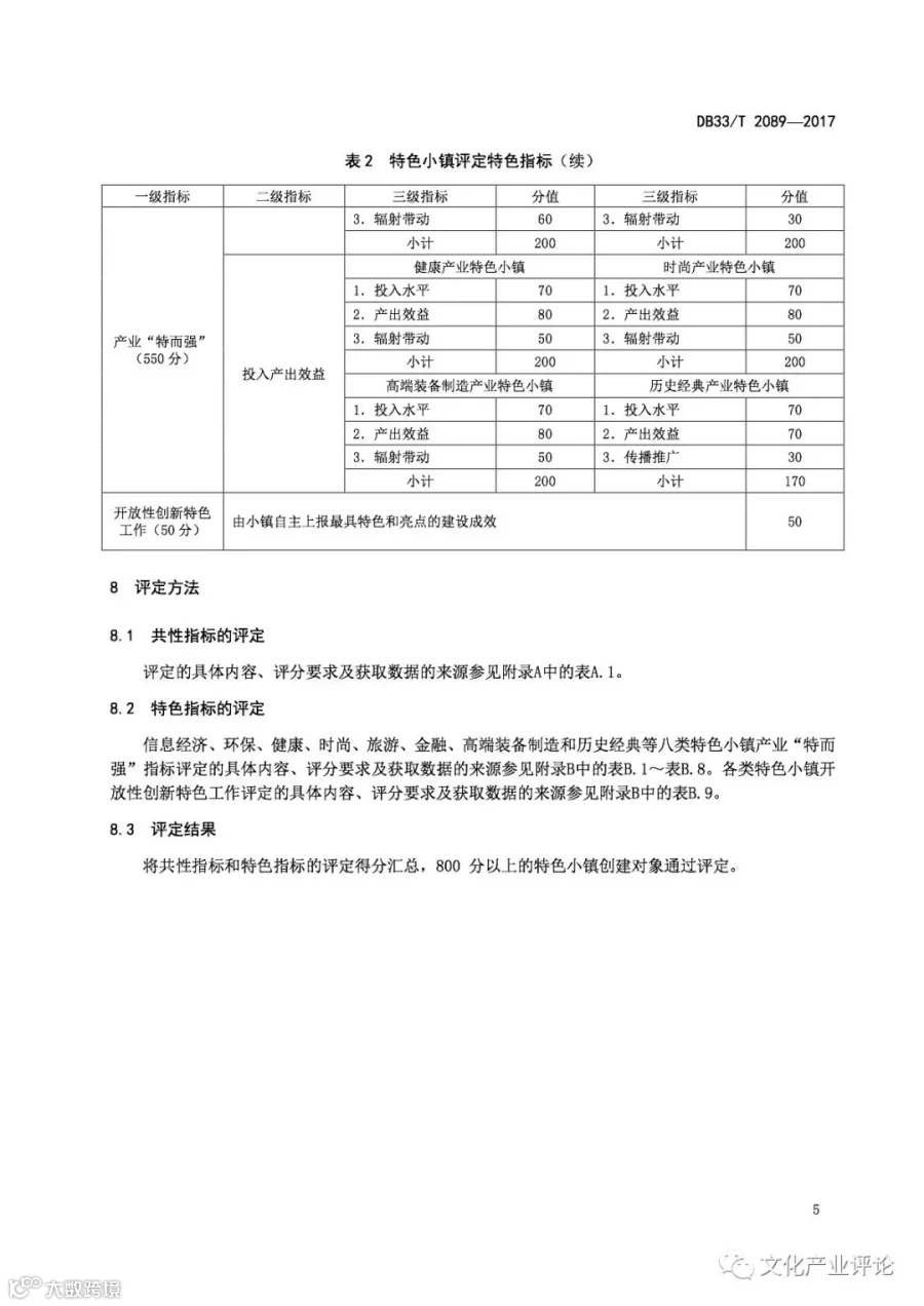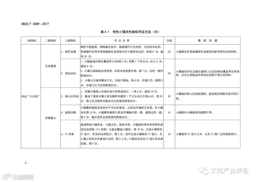 《特色小镇评定规范》由浙江省发展和改革委员会牵头组织,浙江省发展和改革研究所和浙江省标准化研究院共同起草,围绕以居民为主体、以特色产业为核心的“非镇非区”、产城融合的特色小镇建设,突出特色个性,注重分类评价;突出产业核心,注重经济培育;突出质量示范,注重高端引领;突出改革创新,注重市场主体;突出科学操作,注重标准规范。该规范提出特色小镇“1+8”的评定指标体系,由共性指标和特色指标构成:在明确特色小镇功能“聚而合”、形态“小而美”、体制“新而活”的共性要求基础上,针对信息经济、环保、健康、时尚、旅游、金融、高端装备制造和历史经典8类特色小镇产业特点分别设置三级特色指标,充分尊重不同特色小镇的独特个性,使之形成具有相对普遍指导意义的特色小镇建设发展模式。
