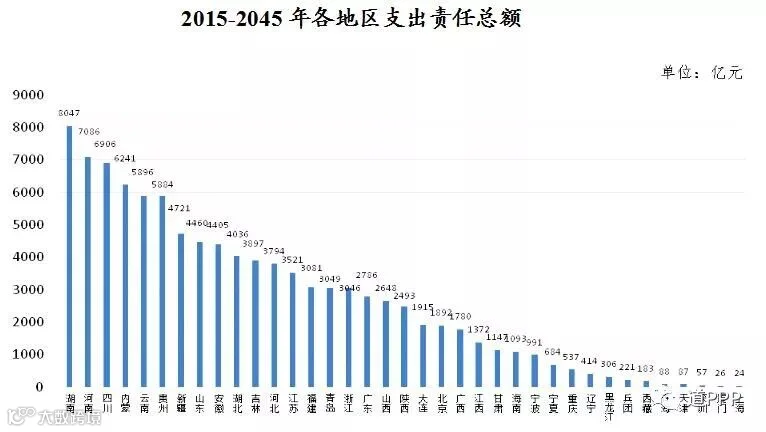 从地区分布看,中西部地区支出压力较大。2015-2045年间,支出责任总额前五位的分别为湖南8047亿元、河南7086亿元、四川6906亿元、内蒙古6241亿元和云南5896亿元,年均支出分别为260亿元、229亿元、222亿元、201亿元和190亿元,分别占2017年本省一般公共预算支出的3.8%、3.1%、2.6%、4.4%和3.3%。