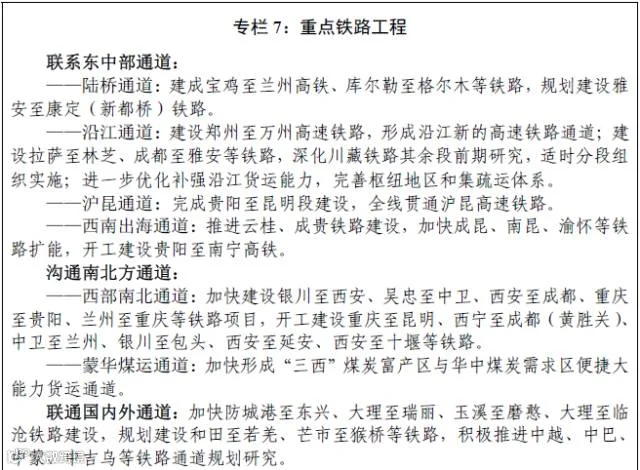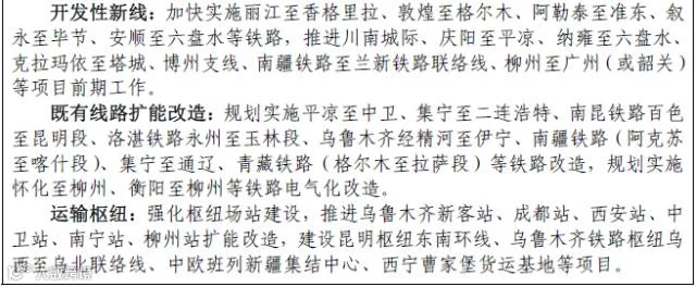 铁路:汉中至巴中至南充铁路、昭通至攀枝花至大理铁路、成都至格尔木铁路、绵阳至遂宁至内江铁路。