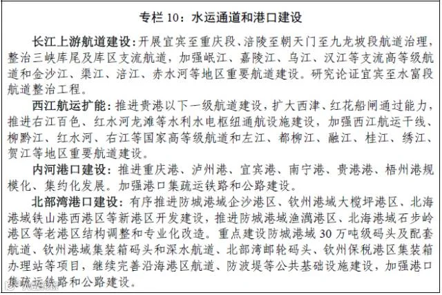 加快重庆长江上游航运中心建设;以重庆港、泸州港、宜宾港、南宁港、贵港港、梧州港等港口为重点,加强港口集疏运体系建设。