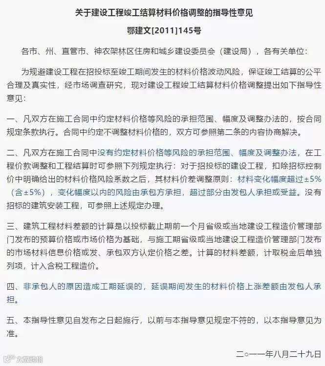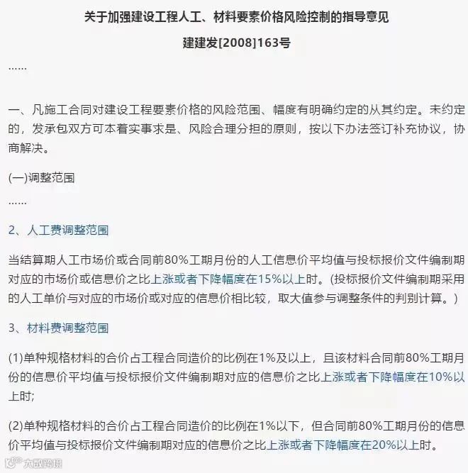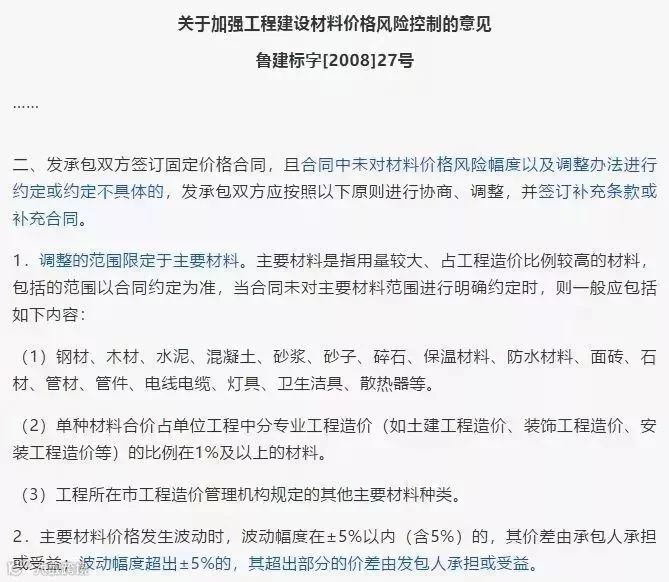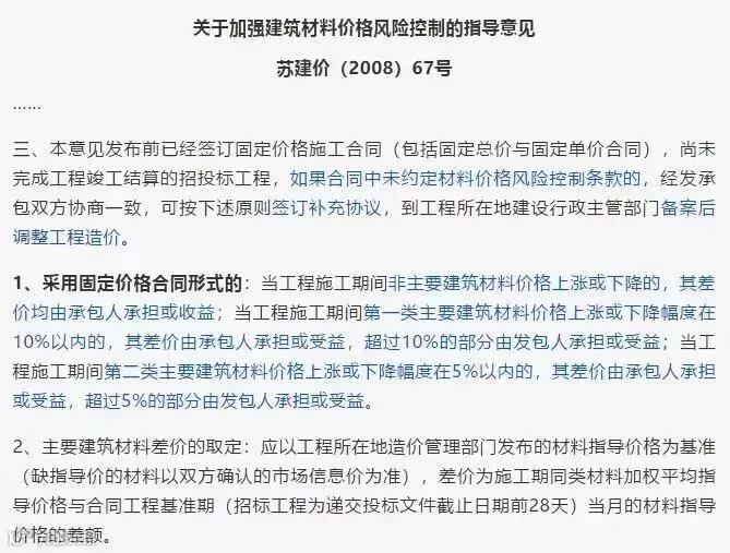其实早在2007、2008年,因人工、材料、台班价格出现持续大幅度的涨落,全国多个省份已出台文件,就“合同中未明确或强行约定承包人承担全部风险”的问题作出明确规定,要求发承包双方需签订补充协议,进行价差调整。