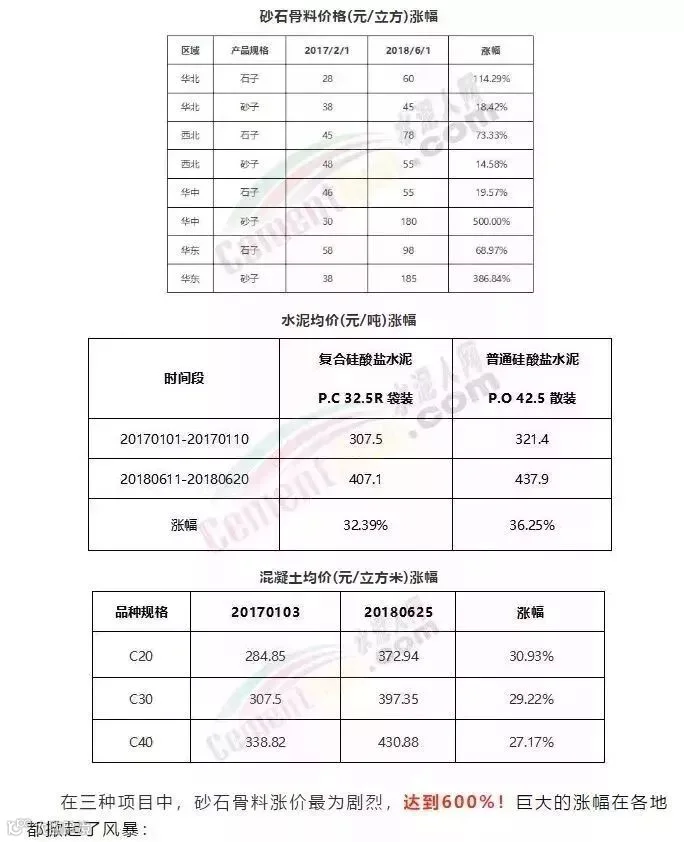 除了上述这些地区,全国还有河北、广西、湖南等多地砂石市场处于无序涨价或供应混乱的局面,我们这里就不再全部列举。以下是关于全国各地区的水泥、砂石料及混凝土价格的涨幅情况: