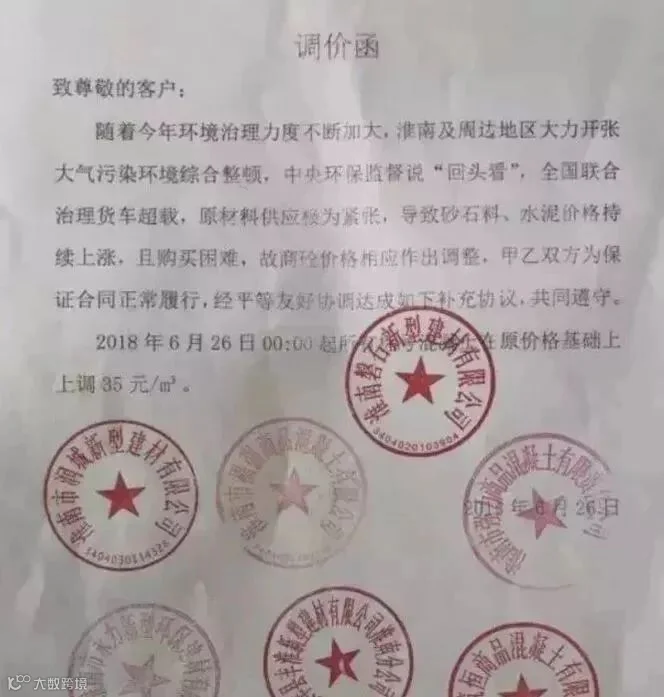 淮南当地砂石、水泥价格持续上涨,且购买困难,当地砼企为了避免恶性竞争,保证混凝土质量,6月26日0时起,所有混凝土在原价格基础上上调35元/方。