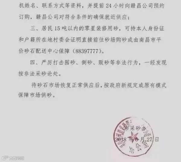 三、居民15吨以内的零星装修用砂,可持本人身份证和户籍所在地村委会证明直接前往砂场购砂或由南昌市平价砂石配送中心保障(88397777)。