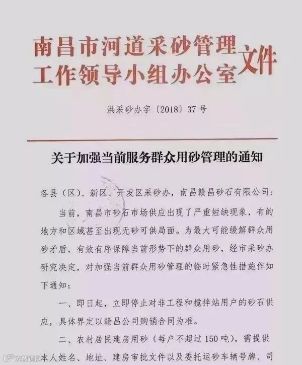 南昌市砂石市场供应出现了严重短缺现象,有的地方和区域甚至出现无砂可供局面。为最大可能缓解群众用砂矛盾,有效有序保障当前形势下的群众用砂,经南昌市采砂办研究决定:
