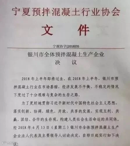 6月25日,宁夏混凝土行业协会发布《银川市全体预拌混凝土生产企业决议》: