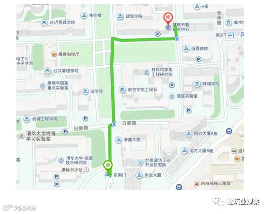 清华大学东南门向正北方向出发,走110米,右转穿过马路继续向前,走170米右转,走130米左转,走行20米到达终点,预计6分钟,约440米。