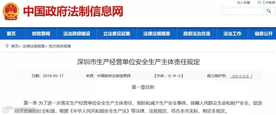 近日,《深圳市生产经营单位安全生产主体责任规定》在中国政府法制信息网上公布。《规定》要求:自2018年7月1日起,