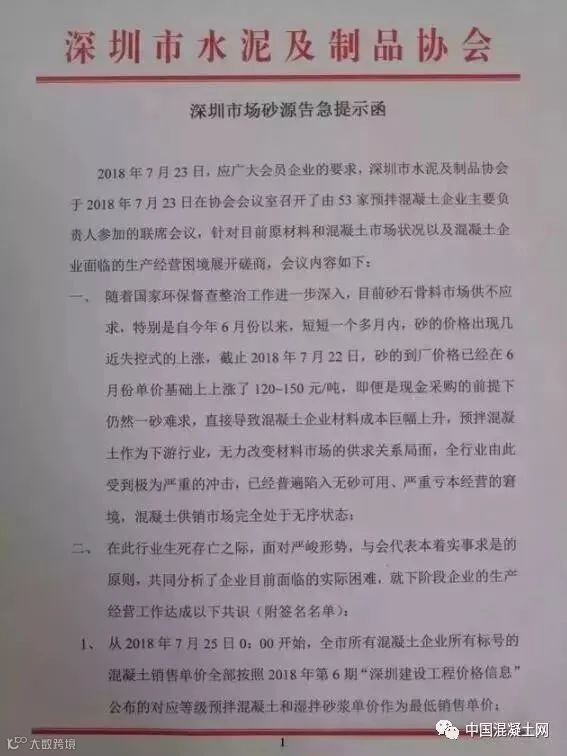 7月23日,深圳市水泥及制品协会发布《深圳市场砂源告急提示函》,该提示函称: