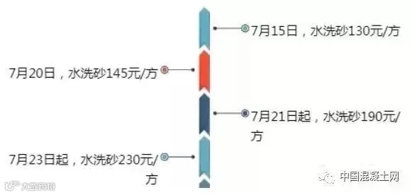 这是广东省中山市一个砂场的一周报价,8天时间里,水洗砂从130元/方暴涨到230元/方,涨幅达到77%。同期,粗砂价格从127元/方上涨到227元/方,涨幅达到79%。