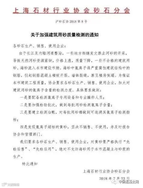 7月23日,上海石材行业协会砂石分会发布《关于加强建筑用砂质量检测的通知》,要求砂石生产、销售、使用企业加大对建筑用砂中氯离子含量的检测力度,绝不允许海砂用于上海市混凝土与砂浆的生产。