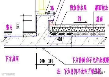 标准做法:屋面烟道根部设置砼反坎,且高度要高出屋面完成面200mm。