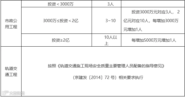 第二十三条 轨道交通工程按照《轨道交通施工现场安全质量主要管理人员配备的指导意见》(京建发〔2014〕72 号)相关要求执行。