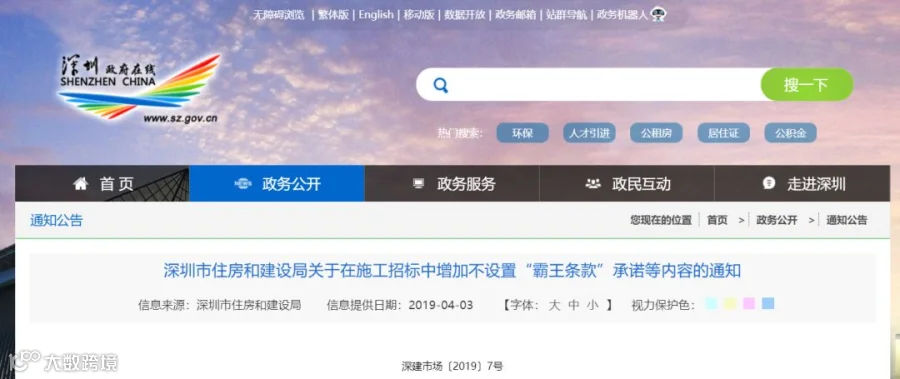 4月3日深圳市住建局发布“关于在施工招标中增加不设置“霸王条款”承诺等内容的通知”,通知明确提出:自2019年4月8日起发布的招标文件,招标人应书面承诺不设置霸王条款,或书面申明已认真审查并评估招标文件及所附合同条款内容,如因坚持设置此类条款造成的一切不利后果,将由招标人自行承担。