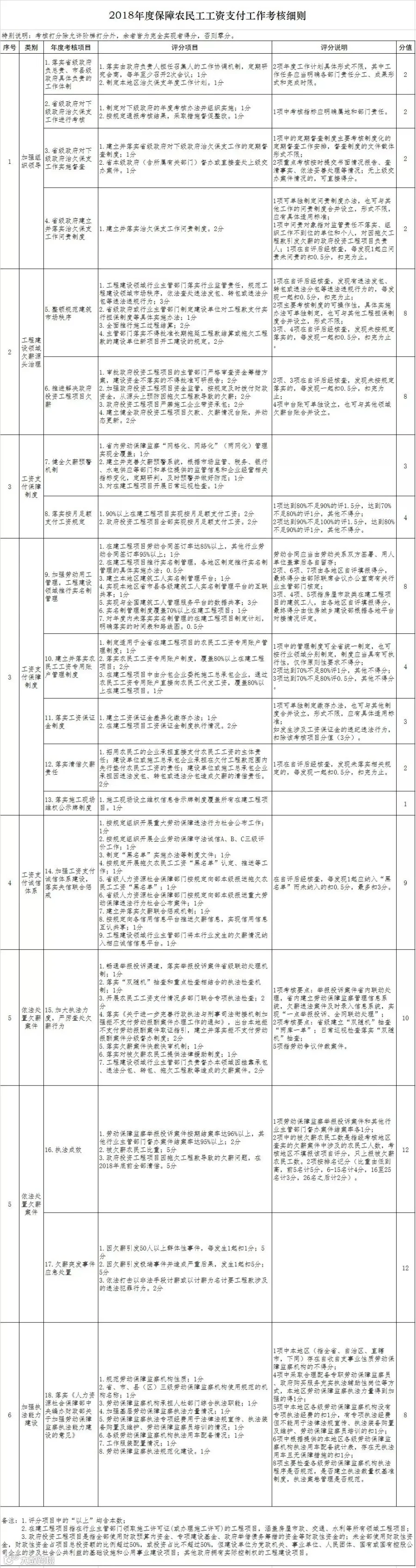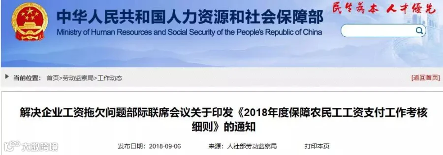 来源:人社部网站、澎湃新闻,原题为《解决企业工资拖欠问题部际联席会议发布《2018年度保障农民工工资支付工作考核细则》》