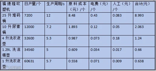 成型数据:六模高速旋转吹塑机生产各个规格产品生产成本统计