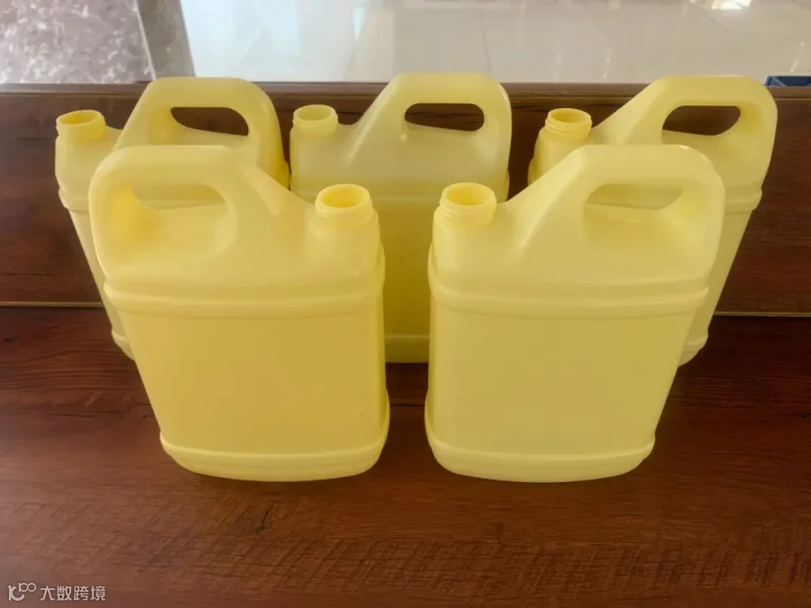 福德隆5升六模高速旋转吹塑机,用于生产一出二1.29L的洗洁精包装桶,生产速度快,产量高,机器稳定。