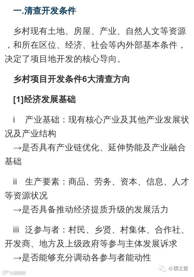 6)乡村基础设施等六大项基础条件的清查,我们能对乡村项目建设所需的核心条件作出基本的细化判断,而乡村项目是否具备开发价值,也应根据上述的资源及条件清查,做出综合性的判断。