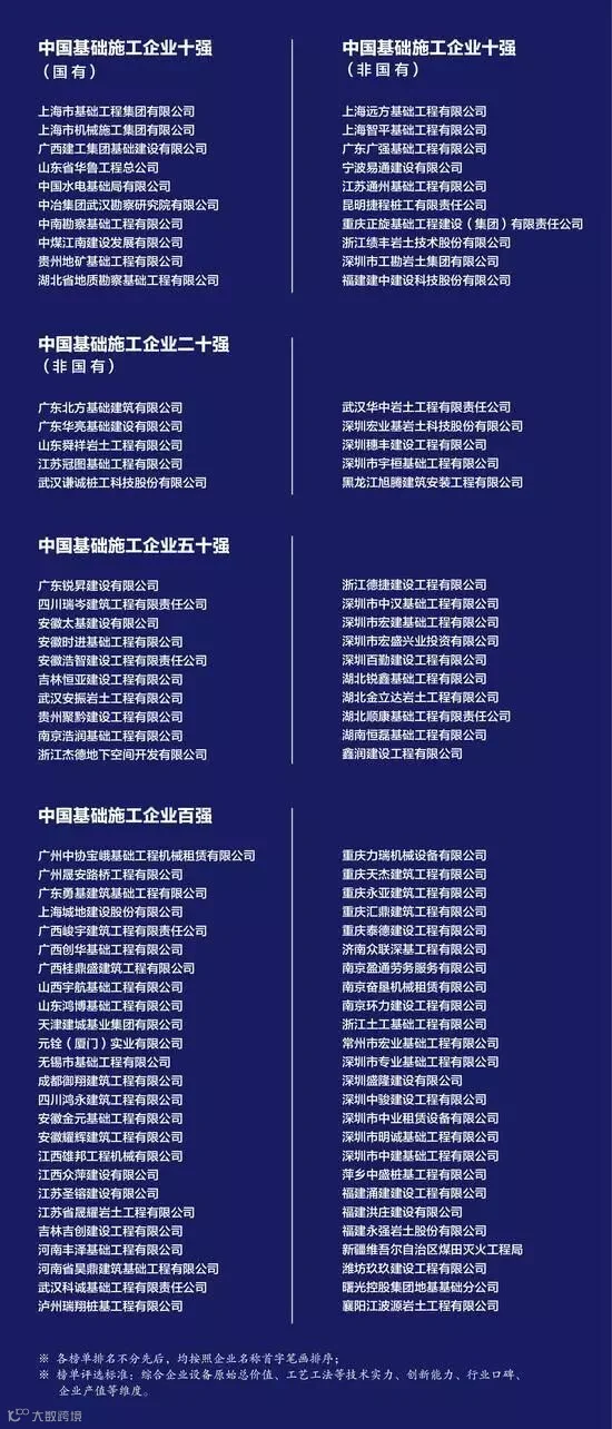2018年11月26日,由全球工程机械产业大会主办的第二届中国基础施工企业百强大会在上海召开。来自德国、意大利、中国的全球桩工设备制造商领军企业,以及中国基础施工领域领先企业,参与峰会。会上发布了2018年中国基础施工10强、100强榜单。