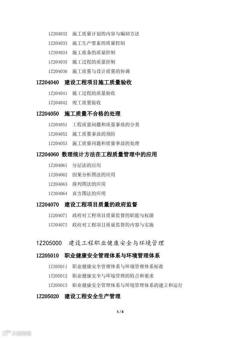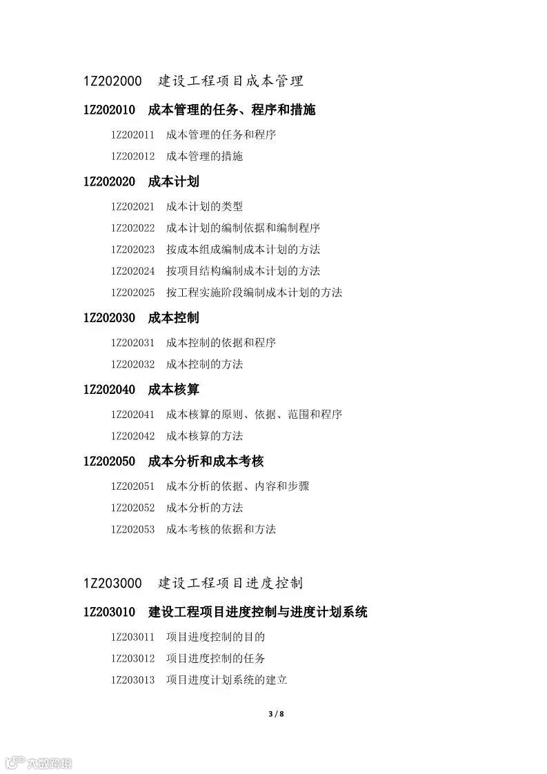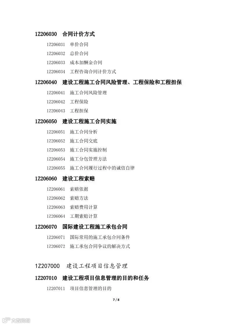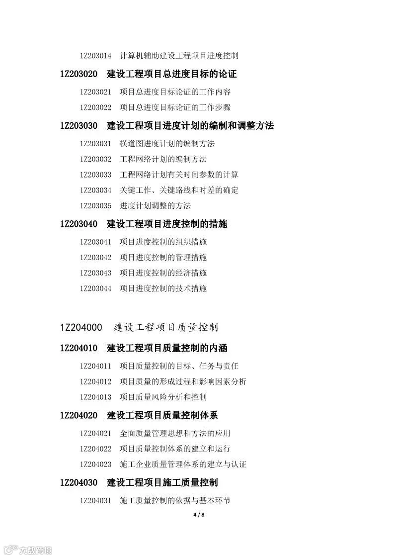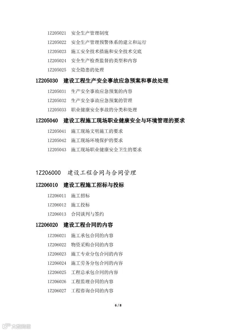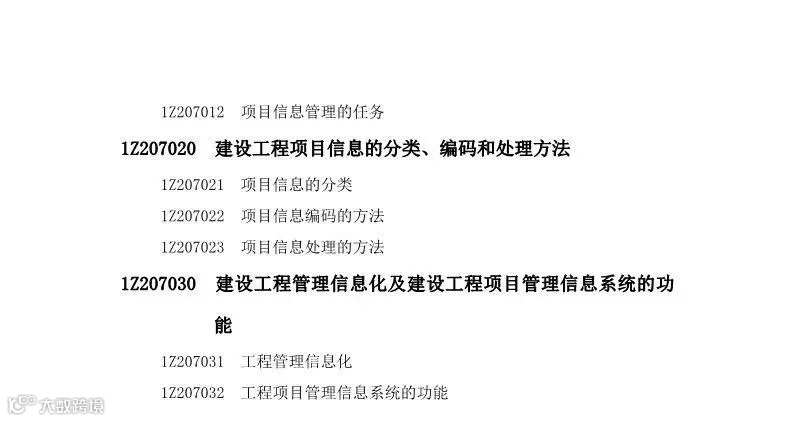 《一级建造师执业资格考试大纲》对专业、级别以及章、节、目、条用编码的形式表示,编码长度为8位。具体说明如下: