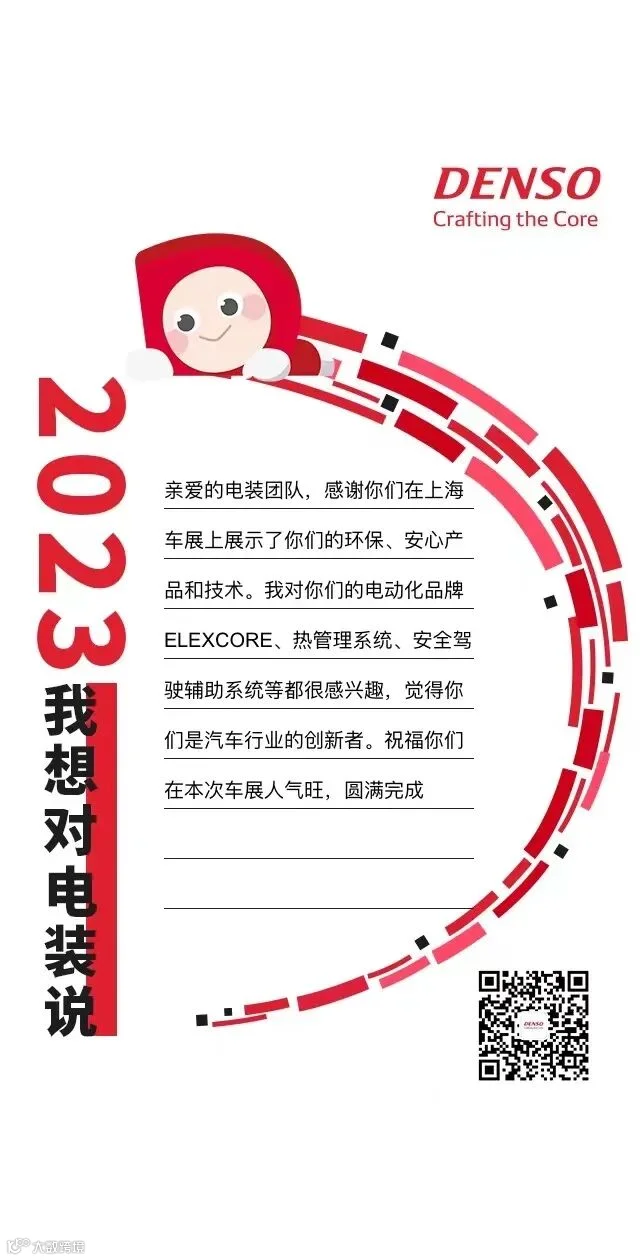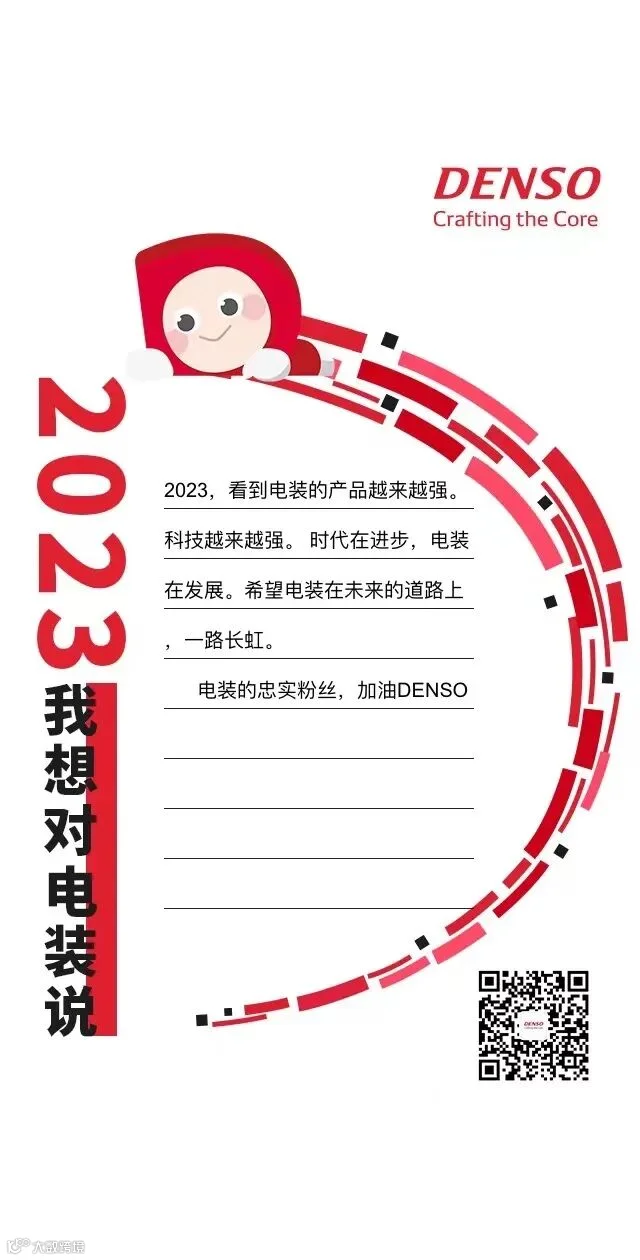 电装品牌口号“Crafting the Core”传达了“电装会更大的发挥代表企业灵魂的造物精神,创造新的价值,为世界打造各种核心事物”的意愿。建设人、车、环境和谐共存的美好未来是电装的愿景,今后电装将继续致力于环保、安心·安全技术和产品的开发,积极为中国社会作出贡献。