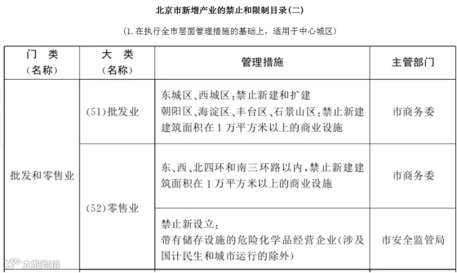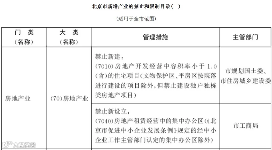 4、全市范围内禁止新设立:房地产租赁经营中的集中办公区(《北京市促进中小企业发展条例》规定的经中小企业工作主管部门认定的集中办公区除外);
