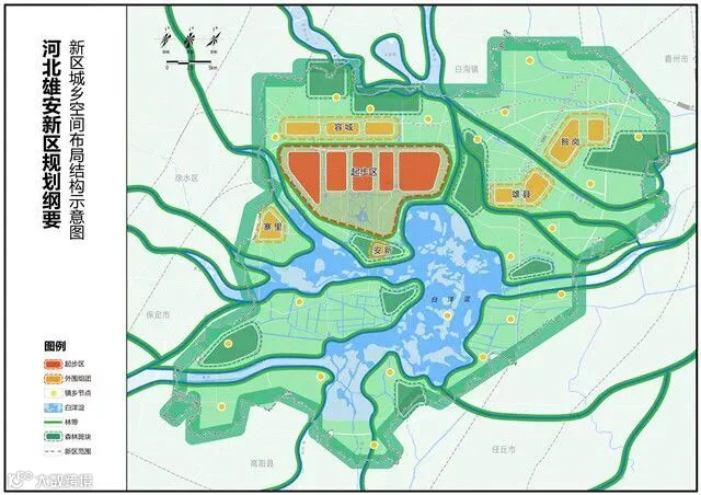 “一主”即起步区,选择容城、安新两县交界区域作为起步区,是新区的主城区,按组团式布局,先行启动建设。“五辅”即雄县、容城、安新县城及寨里、昝岗五个外围组团,全面提质扩容雄县、容城两个县城,优化调整安新县城,建设寨里、昝岗两个组团,与起步区之间建设生态隔离带。“多节点”即若干特色小城镇和美丽乡村,实行分类特色发展,划定特色小城镇开发边界,严禁大规模开发房地产。