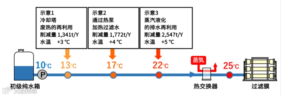 由于半导体中的杂质会对电阻率造成较大的影响,因此便对清洗半导体的纯水水质提出了更高的要求。而符合纯水水质标准的纯水通常需要通过过滤装置去除水中的杂质,过滤时一般采用蒸汽加热,将温度上升至25℃以达到加热过滤效果。电装在利用蒸汽加热纯水的环节中,通过工厂废热的再利用达到大幅降低蒸汽量的效果。