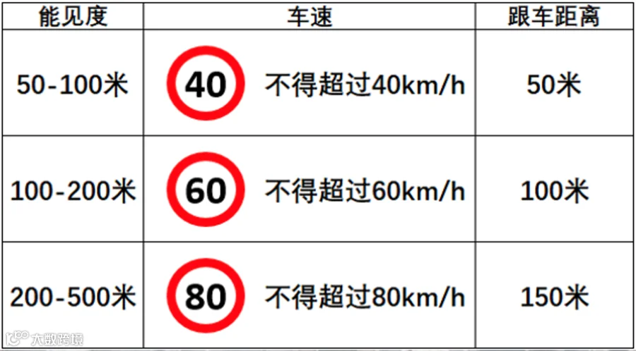 车辆一旦进入团雾或大雾区域,应立即减速,严格遵守规则限速行驶