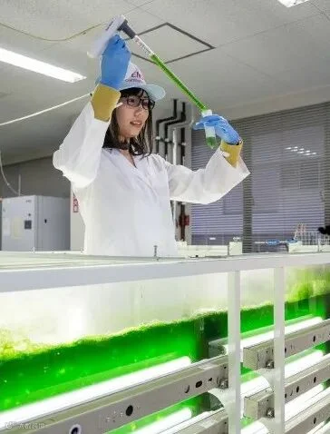 ↑ 在位于日本爱知县日进市的先进技术研究所内,小到烧杯实验,大到500升大型培养槽,科研人员们精心培养各种微细藻类,并观察其特性。