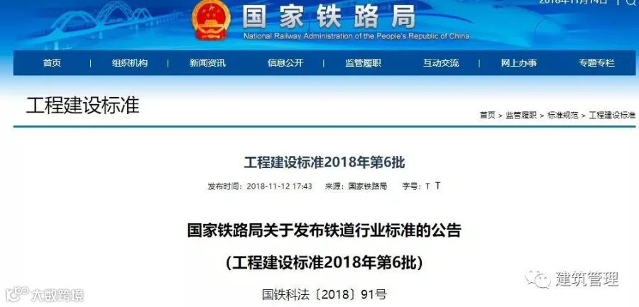 2018年11月12日国家铁路局发布铁路工程施工质量系列验收标准,进一步完善了以高铁为代表的各类型铁路工程勘察、设计、施工等验收标准体系,为保障铁路工程建设质量和铁路运输安全提供重要依据。
