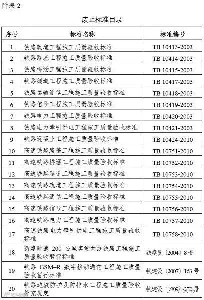 现公布《铁路轨道工程施工质量验收标准》(TB 10413-2018)等17项铁路工程建设标准(详见附表1),自2019年2月1日起实施。《铁路轨道工程施工质量验收标准》(TB 10413-2003)等20项铁路工程建设标准(详见附表2)同时废止。