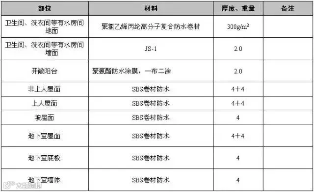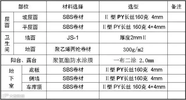 SBS改性沥青防水卷材、单组分聚胺脂防水涂料、聚氯乙烯丙纶高分子复合防水卷材、聚合物水泥(JS-1)防水涂料