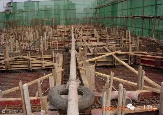 4、 布料机及泵管不得直接搁置在钢筋上。布料机下方用木方铺设,且此部位钢筋骨架要加固,泵管下方用废弃的轮胎铺垫。
