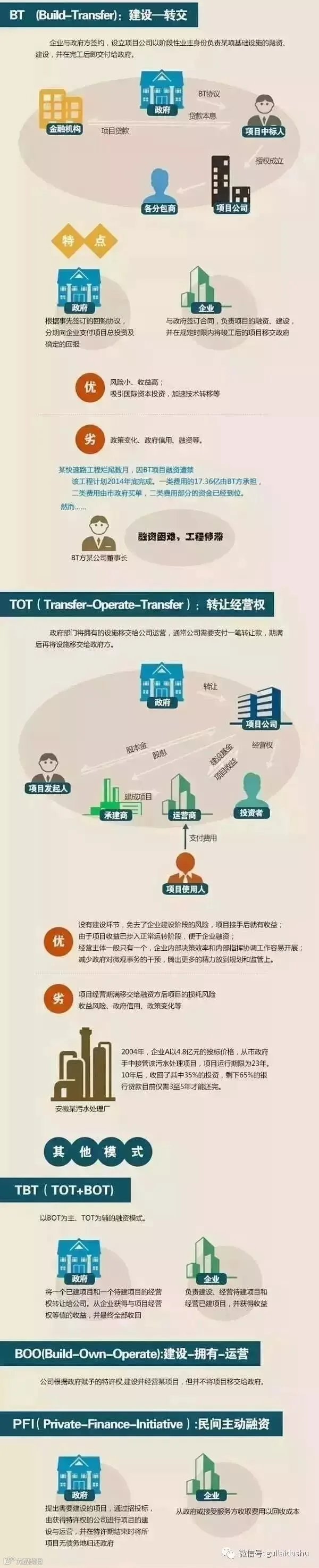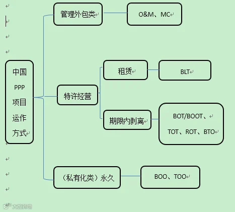 PPP项目运作方式的选择主要由项目类型、融资方式、改建扩建需求、收费定价机制和期满处置等因素决定。从广义的层面讲,公私合作(PPP)应用范围很广。其运作模式主要包括以下几种: