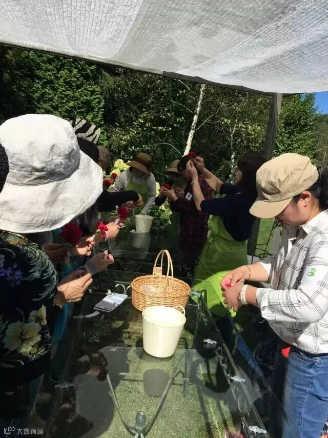 管理员首先带花友们去采摘玫瑰制作玫瑰鲜花。一进入玫瑰田,可以看到一个以白色的休闲区,在北海道纯净的蓝色天空的衬托下,这个休闲区显得静谧而纯洁。在玫瑰田中剪下自己喜欢的玫瑰花之后,就可以来到这里制作玫瑰胸花了。