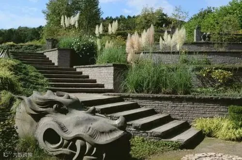 龙园中,随着龙的身体蜿蜒而上的石阶两旁三三两两地种着如《魔女宅急便》中琪琪的魔法扫帚一般的蒲苇。9月,蒲苇银白色的羽状穗花序让露出锋利牙齿的龙多了几分柔和,仿佛是童话中的情景,却又多出了一种沧桑的肃穆感。