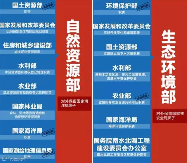 此次改革中,国土资源部改组为自然资源部,环境保护部改组为生态环境部,并且均扩充了许多新的职能,这是因应生态文明战略的具体行动。十九大报告提出,“加强对生态文明建设的总体设计和组织领导,设立国有自然资源资产管理和自然生态监管机构”。