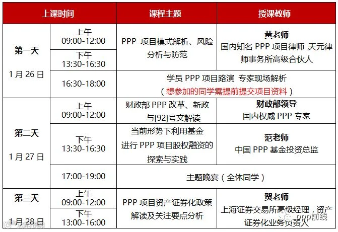 最新政策解读、PPP全流程风险分析与防范,资产证券化操作实务、合同风险管理、利用基金进行PPP项目股权融资的实践等