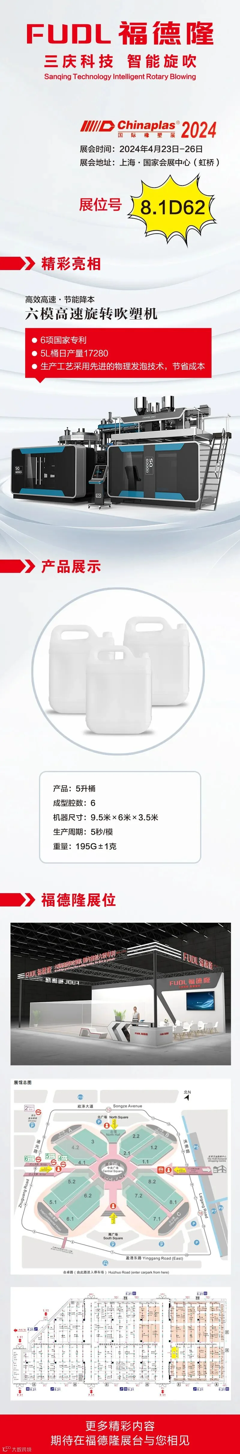 本届CHINAPLAS 2024,福德隆将携六模高速旋转吹塑机创新发泡技术亮相,亮点展示:先进的物理发泡生产技术,六工位高速旋转吹塑机的生产速度,多层设计,油电混配置,明显提升产品生产量,并大大节约生产成本。现场,福德隆技术专家团队会详细介绍产品及服务,并解答各方商客的疑问及需求。
