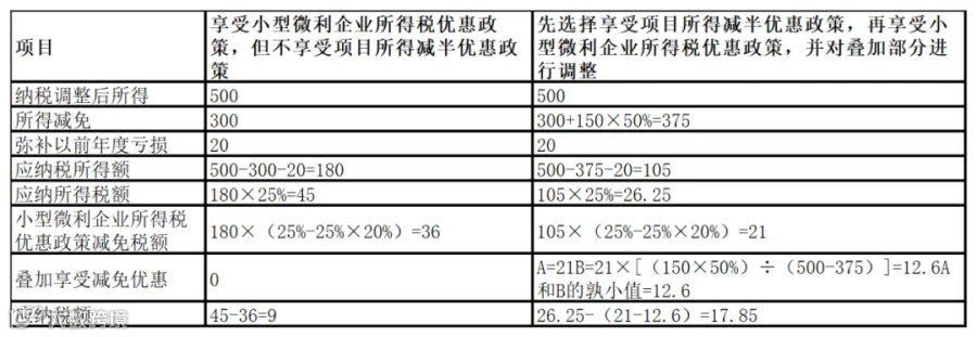 企业可以选择同时享受项目所得优惠和小型微利企业所得税优惠政策,但对于按优惠税率减半叠加享受小型微利企业所得税优惠部分,应当进行调整。叠加享受减免税优惠金额的计算公式如下:A=需要进行叠加调整的减免所得税优惠金额;B=A×[(减半项目所得×50%)÷(纳税调整后所得-所得减免)];叠加享受减免税优惠金额=A和B的孰小值。