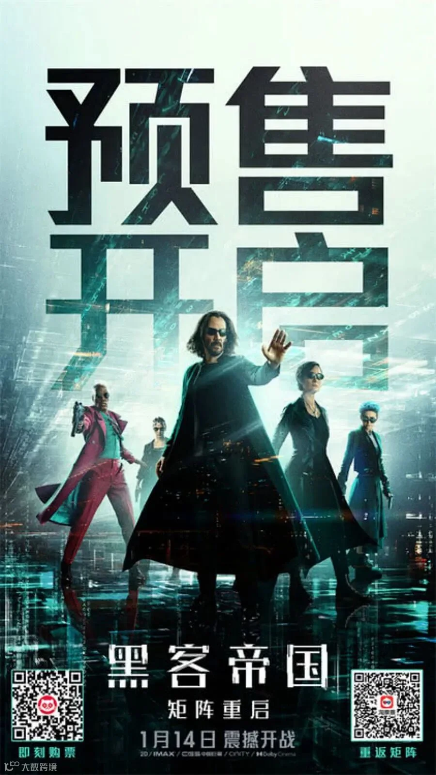 由华纳兄弟影片公司出品的好莱坞科幻动作巨制《黑客帝国:矩阵重启》正式开启预售,影片将以2D/IMAX/中国巨幕/CINITY/杜比影院等多版本格式登陆全国各大影院,届时将为全国观众奉上2022开年燃炸感官的银幕视听盛宴。基努·里维斯携众主创现身,集体问候中国观众,诚挚发出矩阵邀请。1月14日,矩阵升级高能来袭,火速购票,一起加入这场心跳冲击的冒险之旅吧!