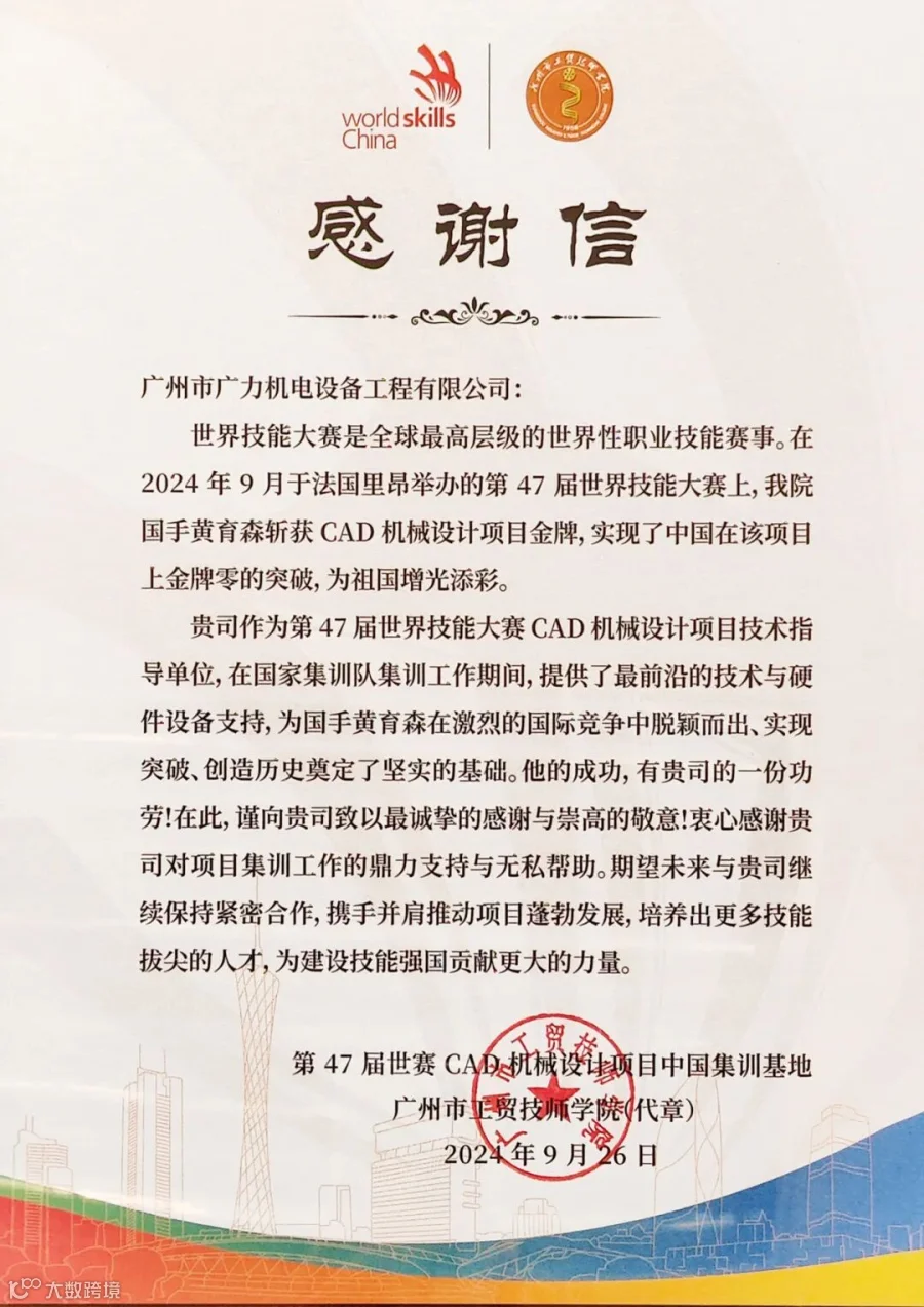 2024年10月18日,“第47届世赛CAD机械设计项目中国集训基地”暨“广州市工贸技师学院”有关领导及教练专程来访并送来了感谢信,对广州广力在本届世赛CAD机械设计项目集训队在集训期间给予的支持表示肯定。