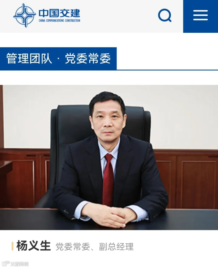 日前,中国交通建设集团有限公司官网显示,公司领导发生调整。杨义生已经担任中国交通建设集团有限公司党委常委、副总经理职务。