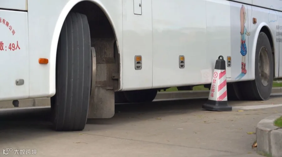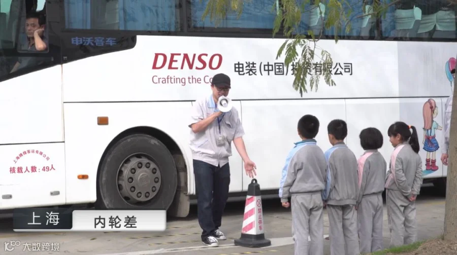 此刻,电装的通勤大巴出场,交通路锥摇身变成“路上的行人”,给小朋友们演示站在内轮差的月牙区域到底有多危险。