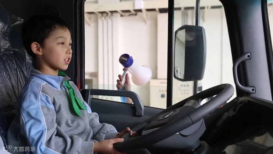 电装在货车的前后左右贴好标志线,这些勾勒出的区域就是司机的视野盲区。当小小体验官坐进驾驶舱,站在盲区中的同学们就神奇地“消失”了。