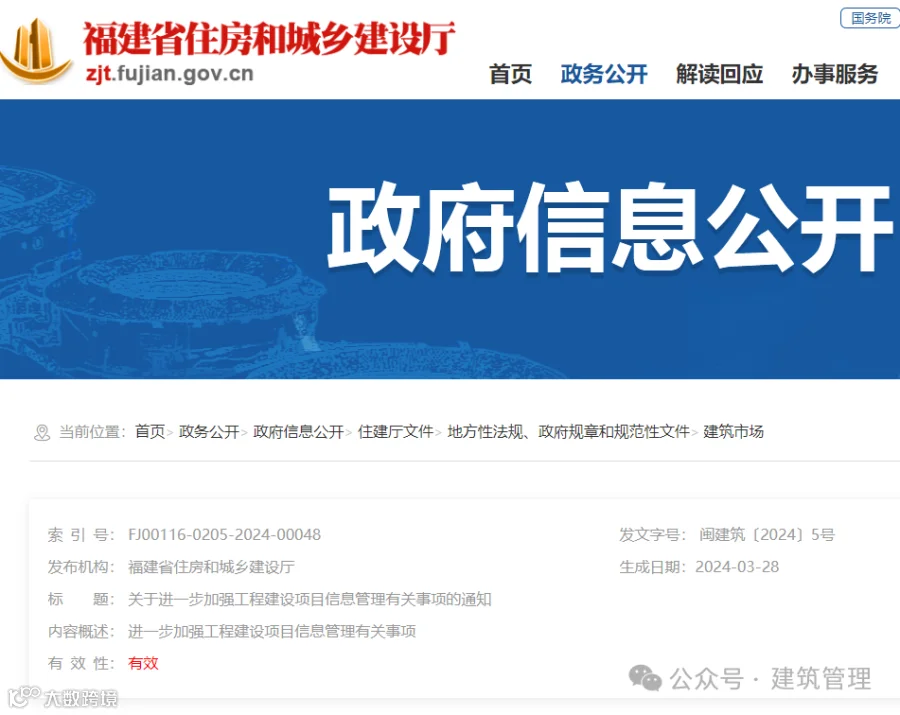 3月28日,福建省住建厅发布《关于进一步加强工程建设项目信息管理有关事项的通知》(闽建筑〔2024〕5号),本通知自2024年4月1日起施行。