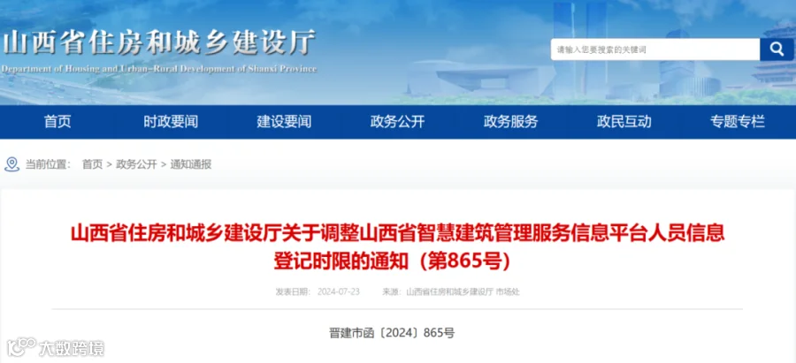 7月23日,山西省住建厅发布《关于调整山西省智慧建筑管理服务信息平台人员信息登记时限的通知》(第865号)。
