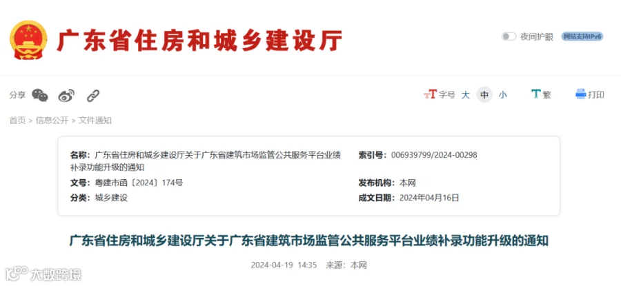 4月19日,广东省住建厅发布《关于广东省建筑市场监管公共服务平台业绩补录功能升级的通知》。