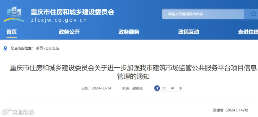 8月14日,重庆市住建委发布《关于进一步加强我市建筑市场监管公共服务平台项目信息管理的通知》。